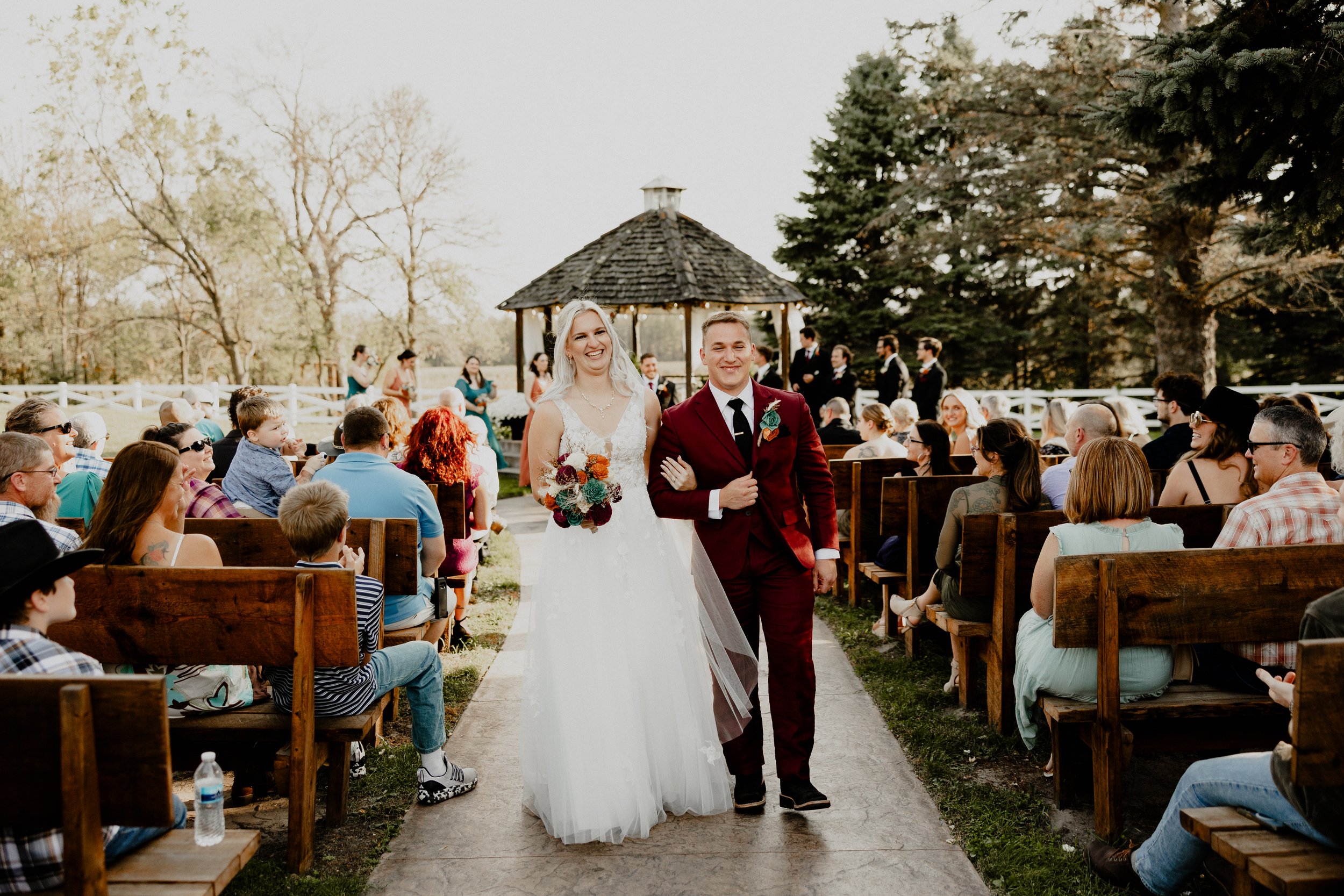 All of your seating and table needs are included in your wedding package. Vintage church pews, rustic chairs, & hand-lettered signs adorn the aisle leading to the gazebo. Our brand new wooden arbor with doors is the perfect finishing touch!